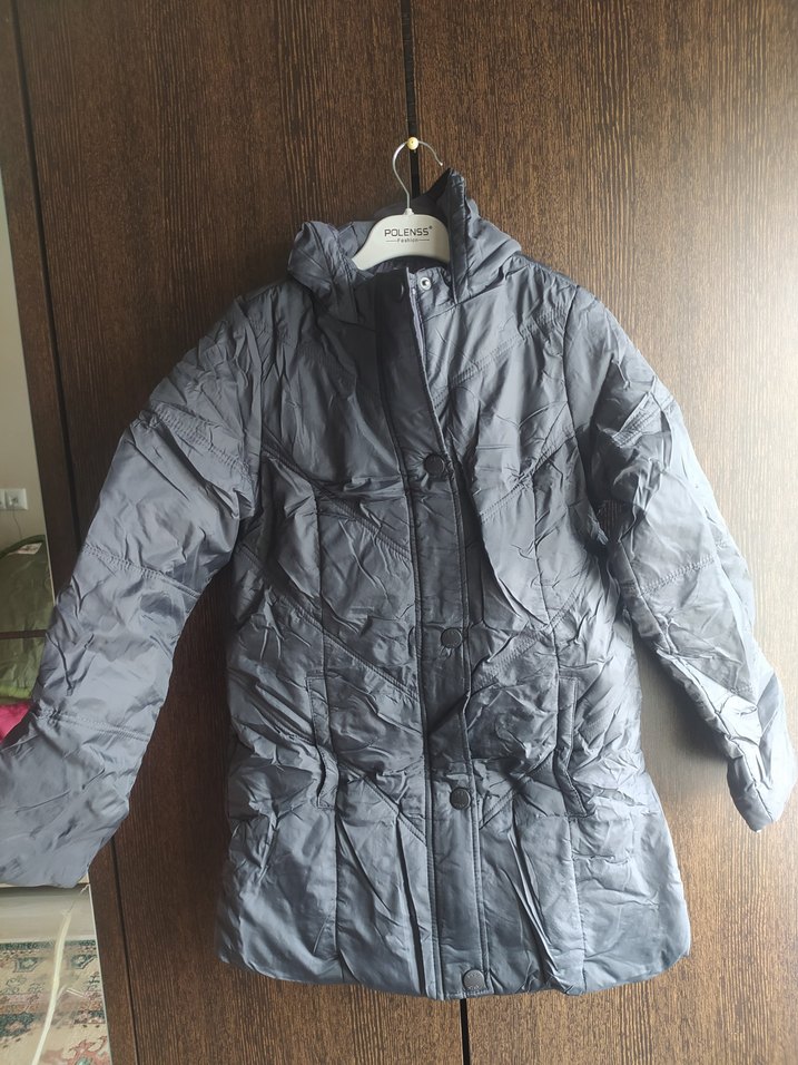 Düğmeli ve uzun kollu, gri kadın kışlık mont. Yumuşak keten kumaştan, normal uzunlukta ve yaka kısmı kesimli. Sokak stili ve dış mekan için uygun. ❄️