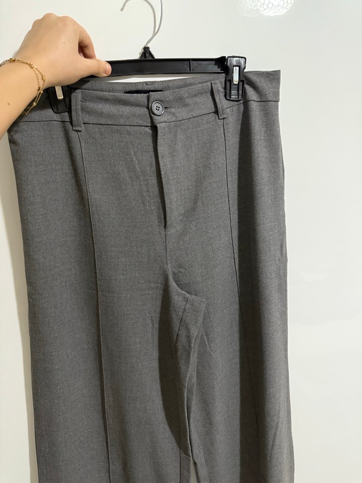 Düğmeli önden kapamalı, yüksek bel ,gri kadın pantolon. Düz, desen içermeyen sentetik kumaştan, ofis için uygun rahat kesim.
