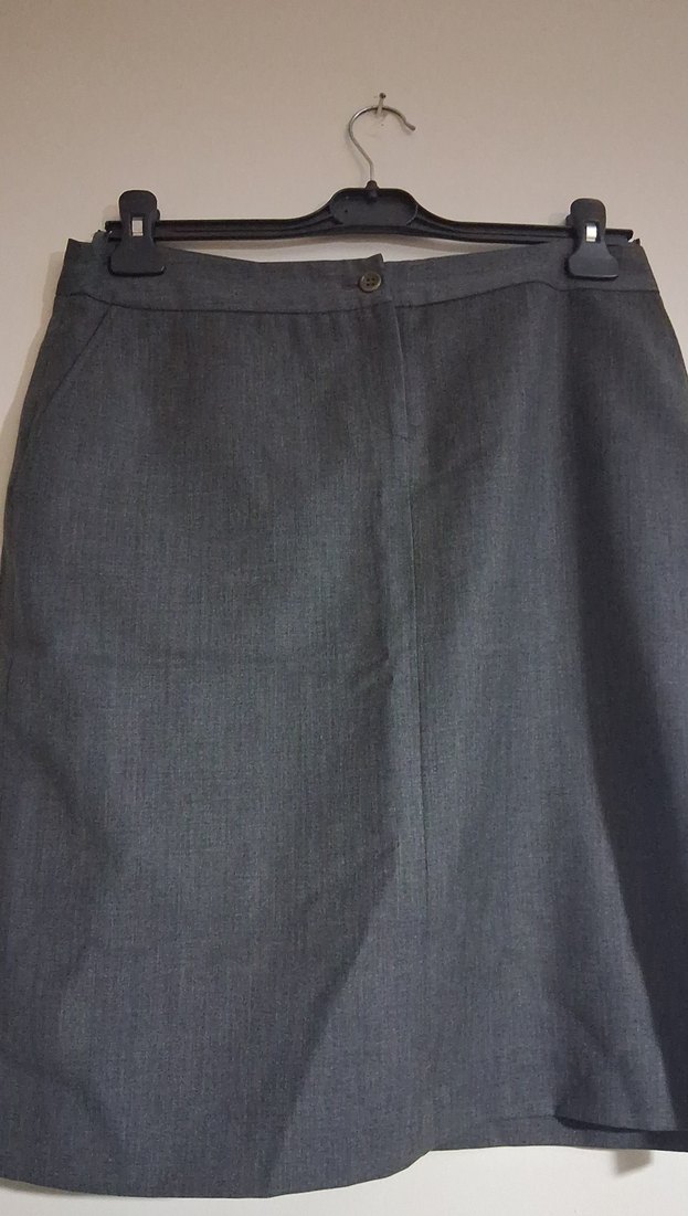 Düğmeli kapamalı, kumaştan yapılmış gri midi kalem etek. Normal kesimi ve desensiz tasarımı ile ofis için uygundur. bel 42 boy 55 cm