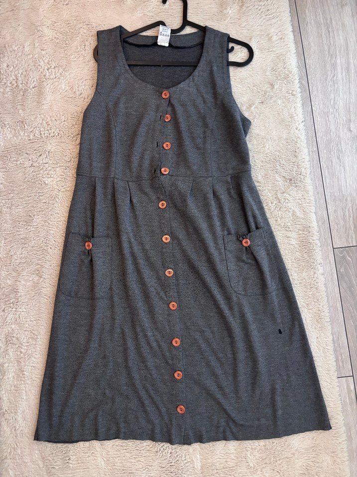 Düğmeli, cepli, yumuşak triko kumaştan yapılmış, salaş kesim gri midi elbise. Günlük kullanım için uygundur.