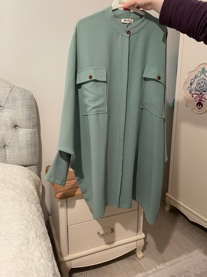 Gevşek kesim, midi uzunlukta, düğmeli ön kısmı ve uzun kollu. Notlu yaka ve yumuşak sentetik kumaştan, ofis için uygun pastel gri renkte.
