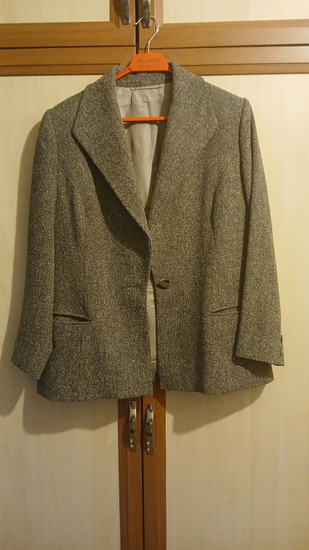 Gri yün kumaştan yapılmış, düğmeli ve normal kalıplı hamile ceket. Notch yaka, uzun kollu ve midi boydadır. Ofis için uygun, vintage tarzda sade tasarım.