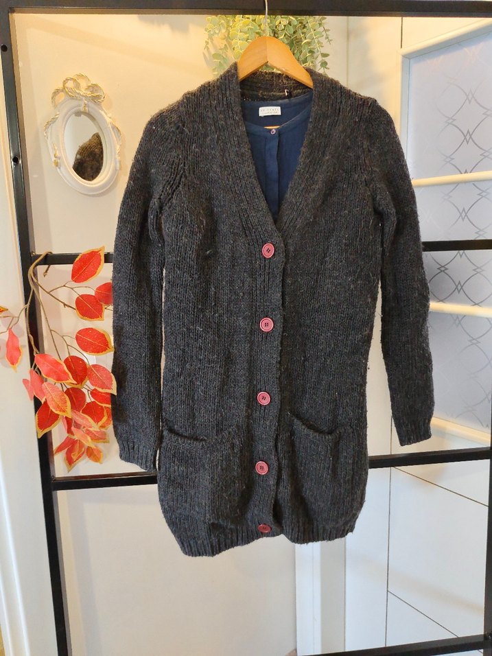 Gri yün hırka, düğmeli ve kesimli yakaya sahiptir. Uzun kollu, bol kesim ve iki ön ceplidir, günlük kullanıma uygundur.