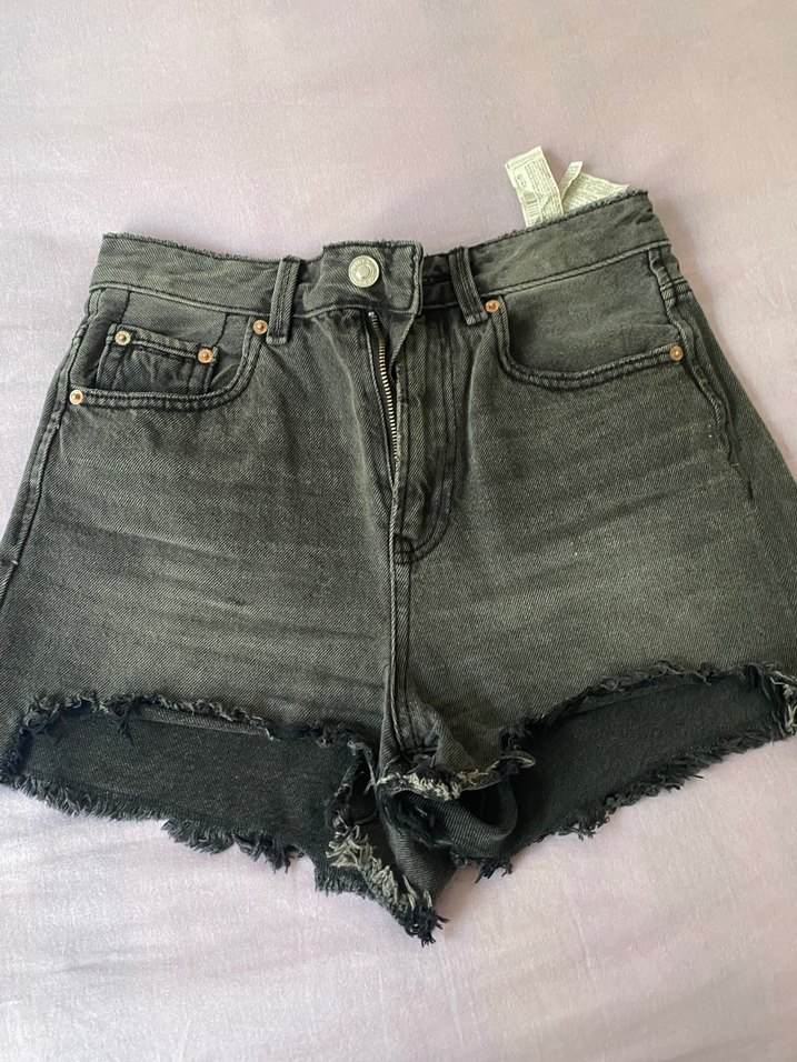 Düğmeli, kesik paçalı gri mini denim şort. Trendy ve günlük sokak stili için uygun, dar kesim şort.