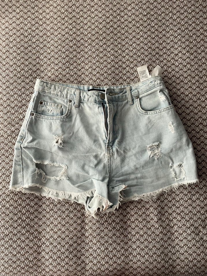 Düğmeli, bol kesim denim mini şort, yırtık detaylı, rahat günlük sokak stili için uygun.