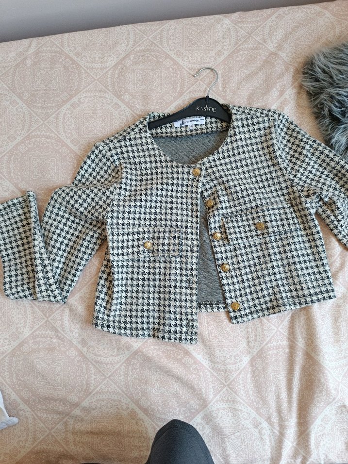 Düğmeli önü ve kesik yakası olan gri mini ceket. Uzun kollu, kare desenli ve rahat kesimdir. Sentetik kumaştan, günlük kullanıma uygundur.