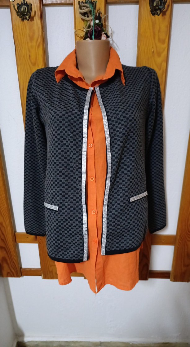 Gri renkte, uzun kollu, Cep ve önlerde taş süsleme detaylı kadın ceketi regular fit ve kısa boyda, her kullanım için uygundur. Cotton mood