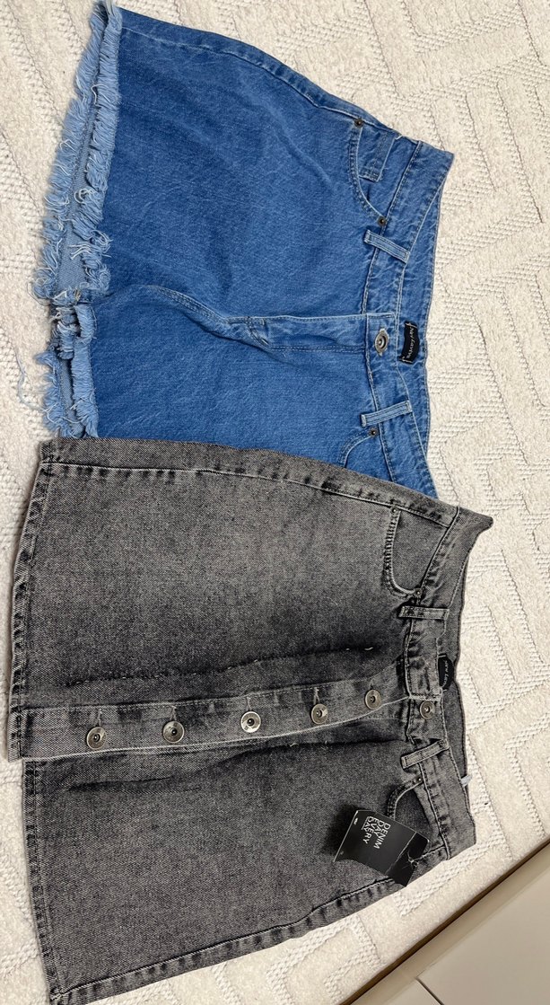 Gri kot kumaştan, düğmeli ve bol kesim mini etek. Kısa boyu ve desensiz tasarımıyla günlük sokak stiline uygun.
