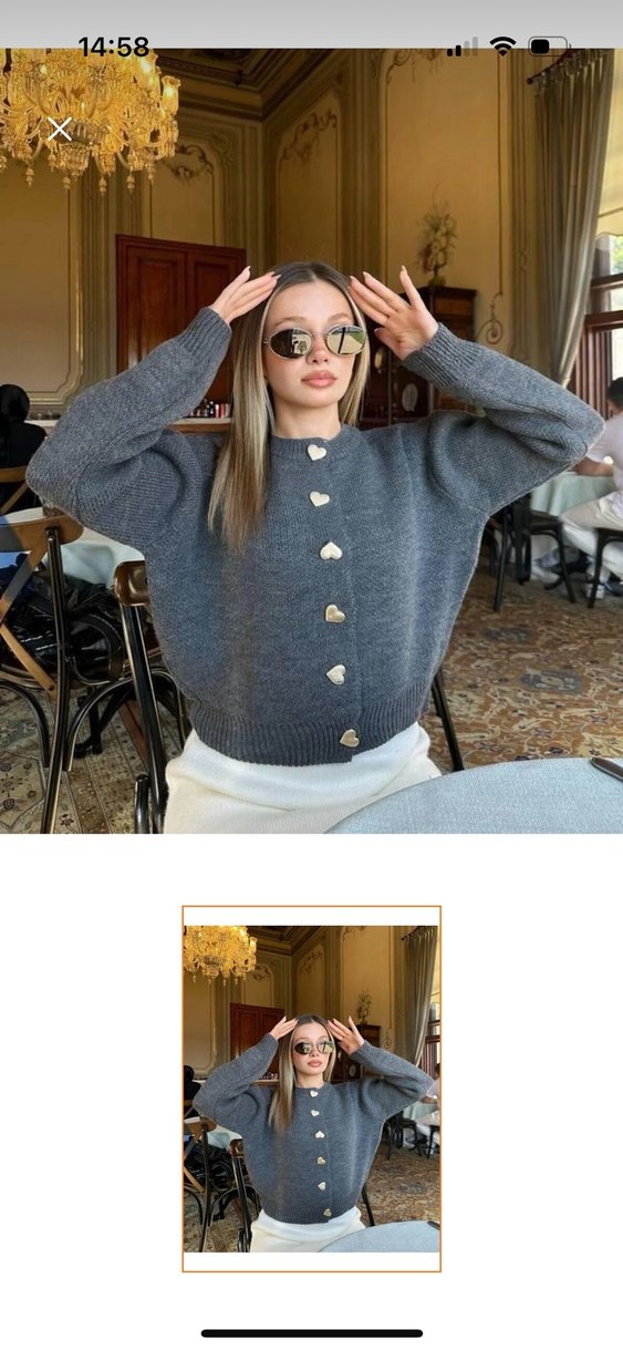 Gri renkli, düğmeli, kısa kesim, uzun kollu, bol kesim kadın örgü hırka. Günlük kullanıma uygun rahat bir tasarıma sahiptir.