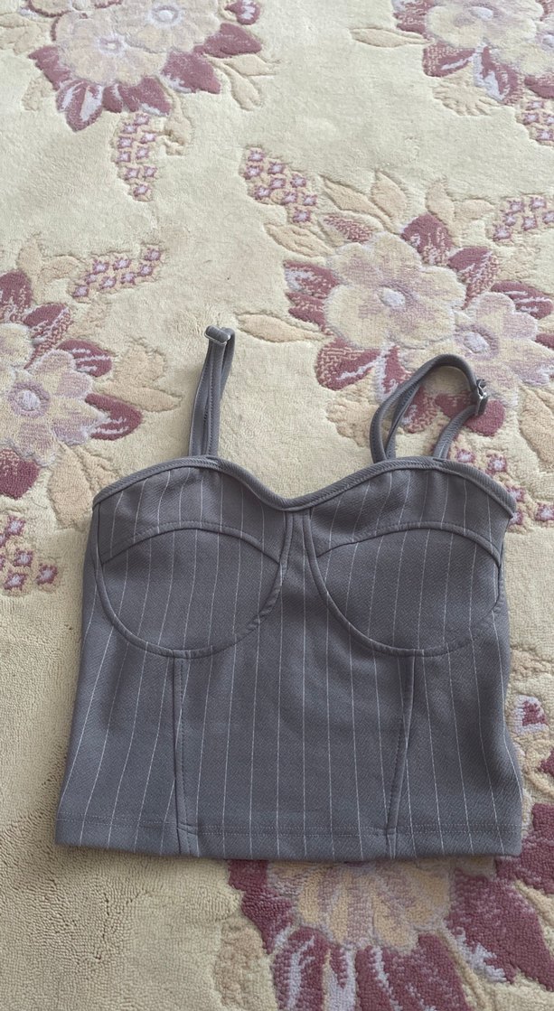 Düğmeli, ince askılı ve hafif çizgili gri mini bustiyer. Pürüzsüz sentetik kumaştan, sokak modasına uygun ve günlük kullanıma elverişli.