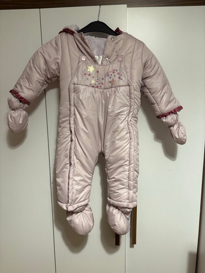 Pastel gri renkli, toz pembe , nakışlı ve düğmeli bebek kız kar tulumu. Notched lapel yakaya sahip ve eldivenli tasarımıyla sıcak tutar. ❄️ beden 12-18, 80 cm