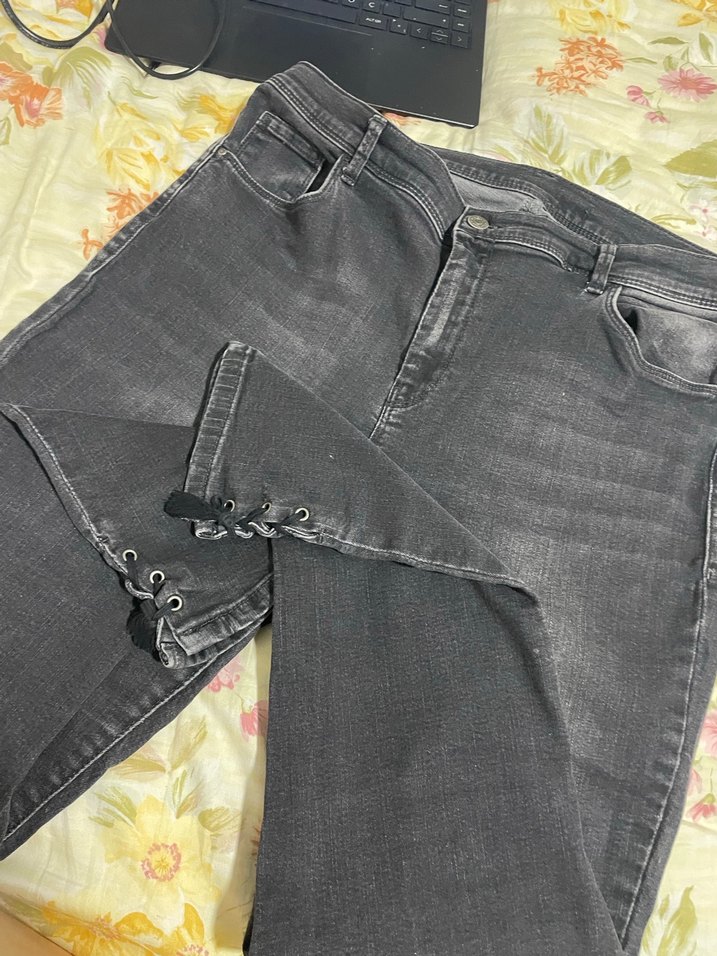 Düğmeli ve nakış detaylı gri denim jean, bol kesimi ve normal boyu ile günlük rahat sokak stiline uygun.