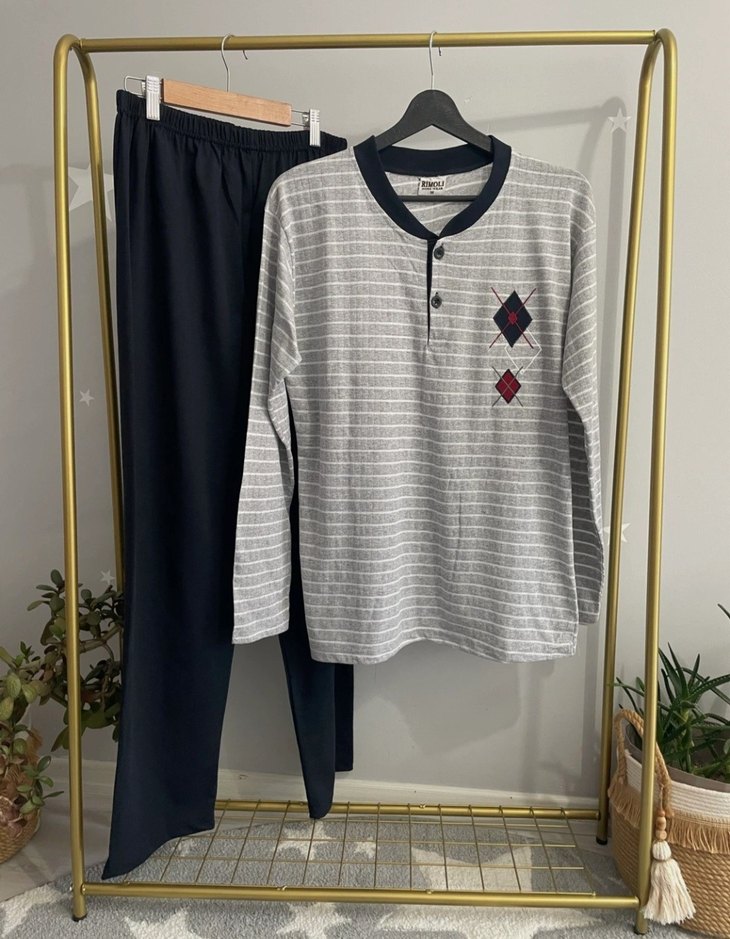 Düğmeli, uzun kollu, bisiklet yaka ve normal kesim gri renkte erkek pijama üstü, nakış desenli ve rahat sokak stili tarzında.Tüm bedenler mevcuttur.