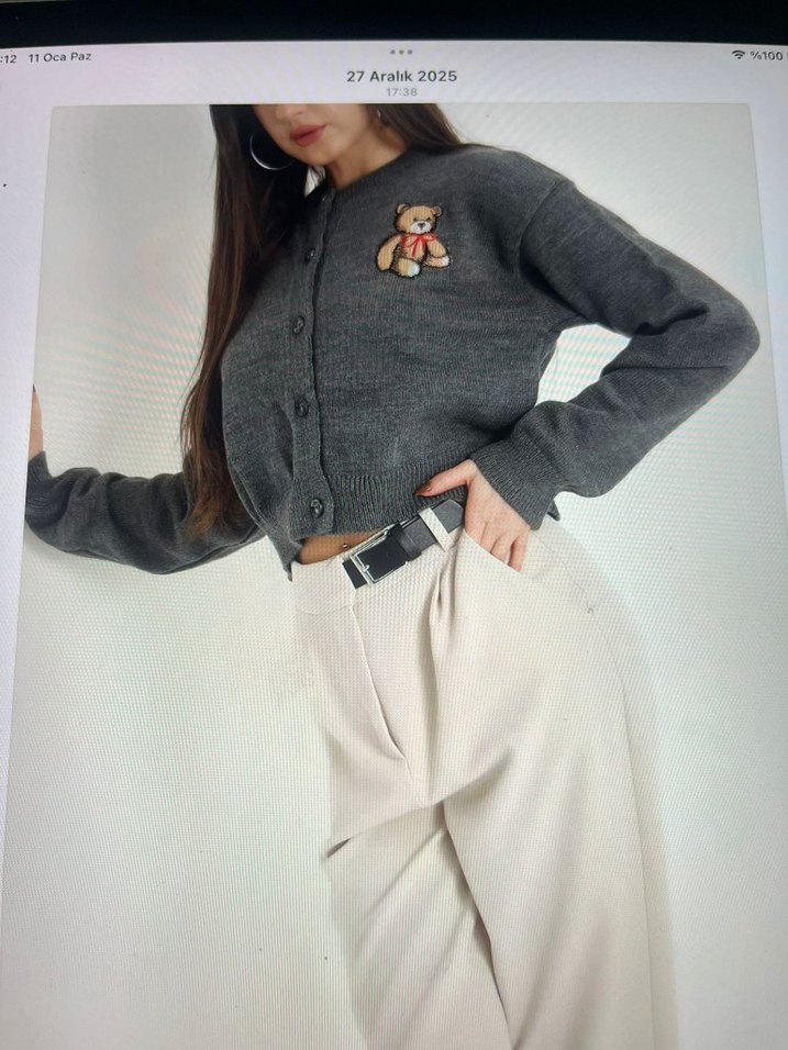 Gri renkli, düğmeli, nakış detaylı uzun kollu kadın hırka. Salaş kesimi ve bisiklet yaka tasarımıyla günlük rahat kullanıma uygundur.