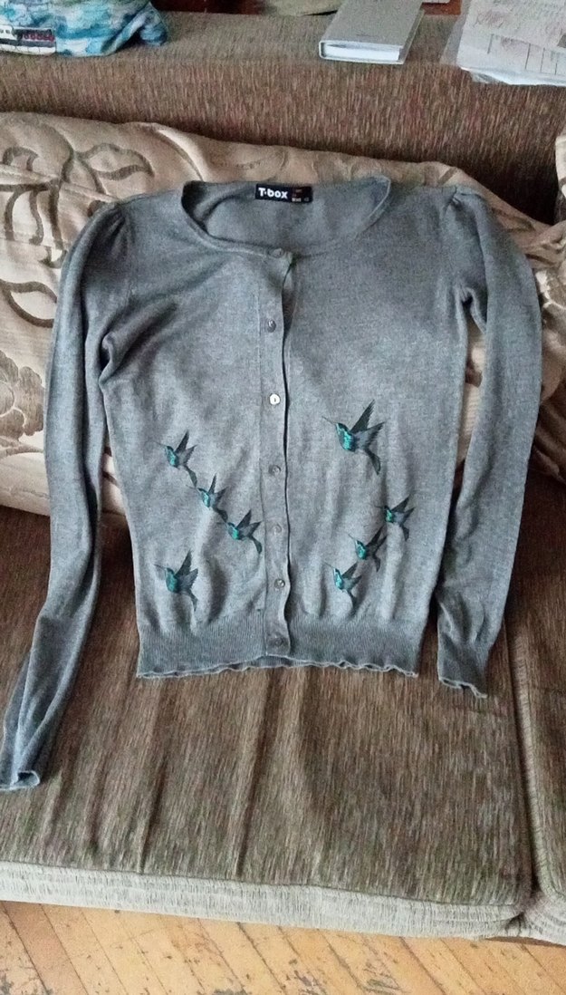 Düğmeli, uzun kollu, yuvarlak yakalı gri triko hırka. Nakışlı kuş desenleriyle günlük kullanıma uygun, rahat ve şık bir parça. marka temsilidir.