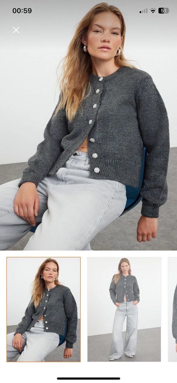 Gri renkli, düğmeli, normal boy midi uzunluğunda, uzun kollu, bisiklet yaka ve bol kesim denim hırka. Rahat günlük kullanım için uygundur.