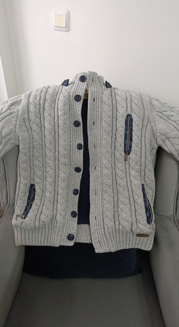 Düğmeli önden kapamalı, atkı yaka gri örgü erkek hırka. Normal kesim, uzun kollu, günlük kullanıma uygun sokak stili.