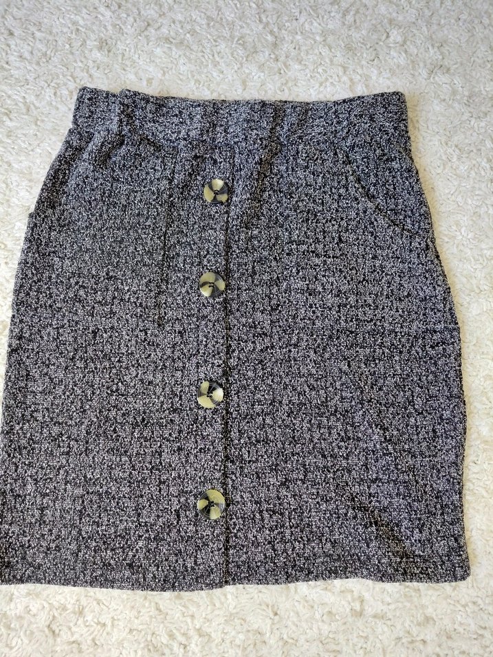 Gri örme kumaştan, düğmeli ve bol kesimli midi etek, rahat ve bohem tarzıyla günlük kullanıma uygundur.