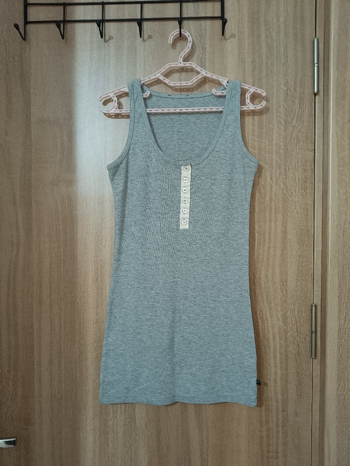 Gri pamuklu, kolsuz kadın atlet, yuvarlak yakalı ve düğmeli ön detaylıdır. İnce kesimi ve midi boyu ile günlük sokak stiline uygundur. standart beden