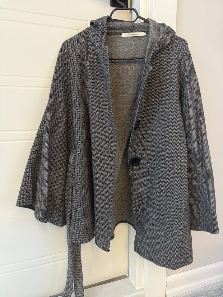 Düğmeli, gri renkli, yumuşak yün kumaştan midi uzunlukta bol kesim Panço. Uzun kollu ve yakası kesik detaylıdır.