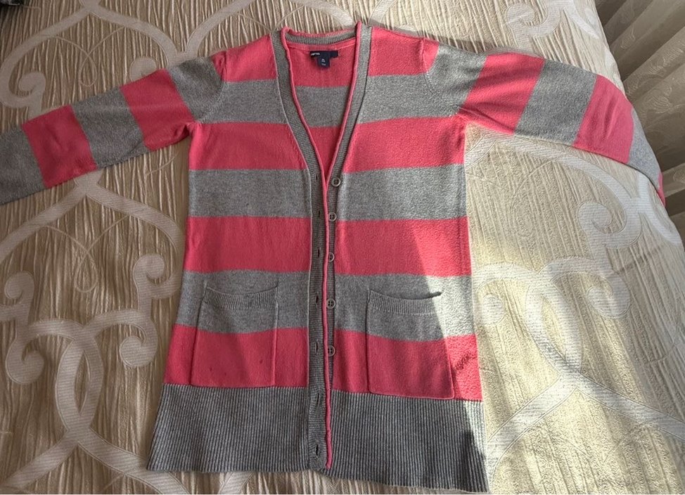 Düğmeli, uzun kollu, V yaka triko hırka. Gri ve pembe geniş çizgili, iki ön cepli, rahat ve şık midi uzunlukta. Günlük ve sokak stiline uygun.Az kullanılmış.