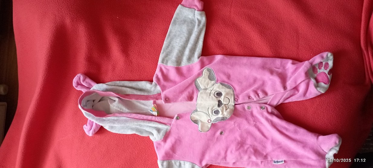 Düğmeli ön kısmı, gri kolları ve pembe gövdesi olan köpek kıyafeti. Nakışlı köpek yüzü deseniyle konfor ve şıklığı birleştirir.