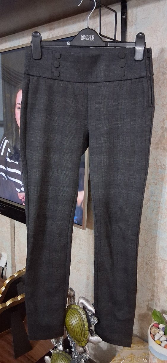 Gri renk, bordo çizgili regular fit, midi boy kadın kalın kumaş pantolon. Yandan 3 Düğme detaylı ve yandan fermuarlı olup likralı esnek rahat pantolon. 28 beden yazıyor 30 bedenede rahatlıkla olur