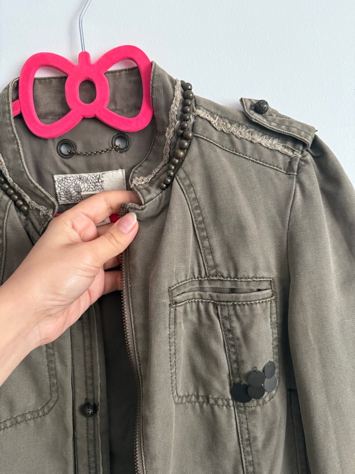 Düğmeli kapamalı, işlemeli detaylı denim ceketin yaka tipi kesik ve kolu askılıdır. Günlük kullanıma uygun rock punk tarzında, vücuda oturan bir modeldir.