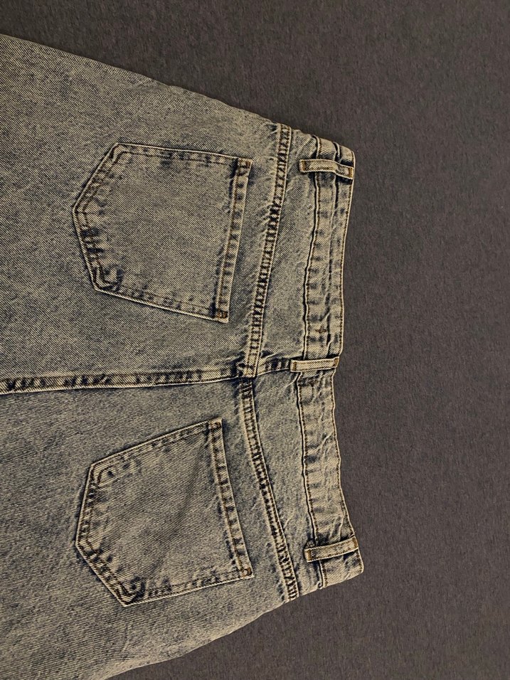 Düğmeli, gri renk salaş kesim kadın kot pantolon. Normal midi boyda, desen içermeyen sokak tarzı, günlük kullanım için uygundur.