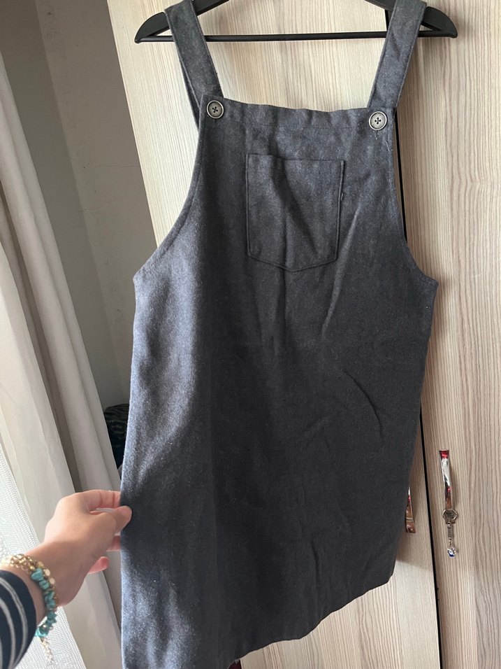 Düğmeli askılı ve ön cepli gri salopet.Sonbahar veya kışın güzelce kombinleyebilirsiniz.