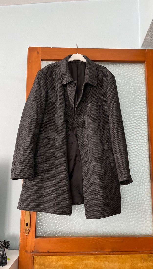 Çok az kullanılmış erkek kaban, düğmeli, kesik yaka ve normal kesime sahiptir. Uzun kollu ve midi boydadır, günlük kullanım için uygundur. 60 beden