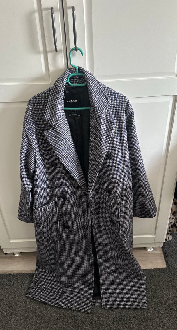 Düğmeli, gri mavi siyah desenli kaban; notched lapel yaka, uzun kollu ve regular fit. , şık ve rahat bir dış giyim parçası.