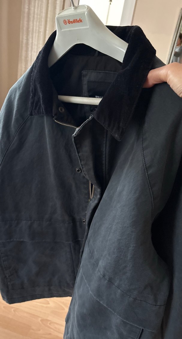 Düğmeli, gri süet kumaştan yapılmış erkek ceket. Notch yakalı, uzun kollu ve bol kesimdir. Günlük rahat kullanım için midi boyda.