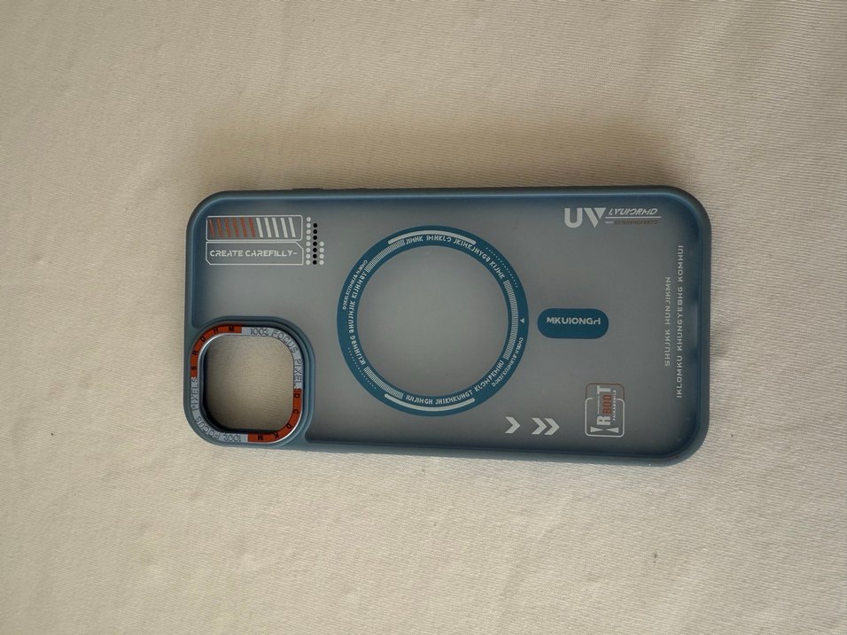 Düğmeli tasarıma sahip gri telefon kılıfı, counterculture tarzında. Üzerinde "MKUIONGH" optik kodu bulunur. Kılıf hastası olduğumuz için ürünler sadece bir iki kez kullanılmıştır