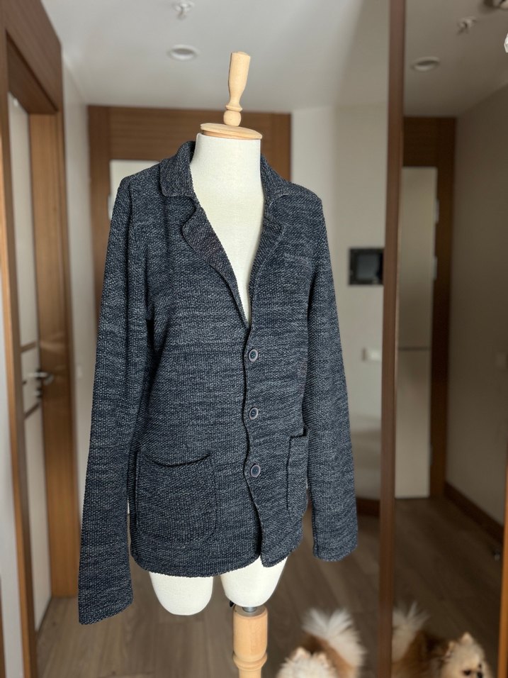 Mavi marka gri renkte, düğmeli, triko kumaştan yapılmış, notched lapel yakalı ve normal kesim uzun kollu ceket. Günlük kullanıma uygundur. S-M beden uyumludur. Sadece yaka kısmında azıcık sökük var fotoğrafta mevcut ama hiçbir şekilde belli olmuyor.