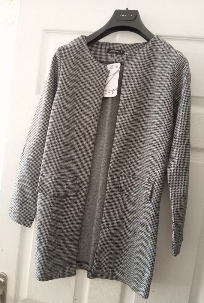 Gri ve siyah minik kaz ayağı desenli triko ceket, cep kapağı olmasına rağmen cebi yoktur. S beden, etiketli hiç kullanılmamıştır. Trendyoldan almıştım.