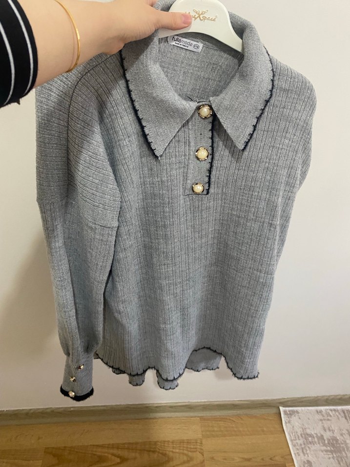 Düğmeli, yakalı gri triko kazak, uzun kollu ve bol kesimdir. Normal boyda olup, kenarları ince detaylarla süslenmiştir. Günlük kullanıma uygundur.