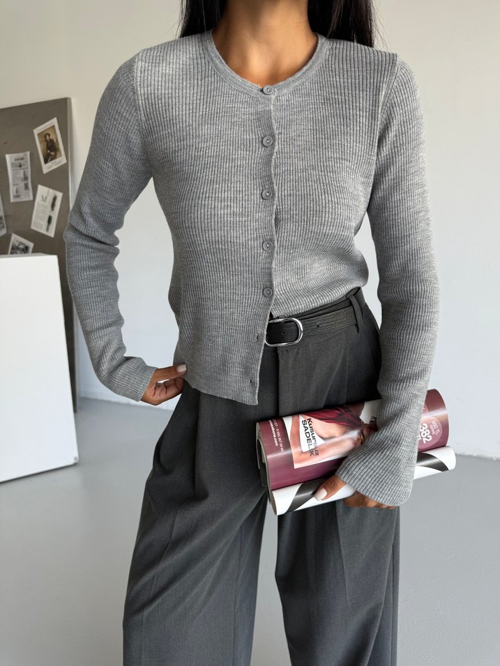 Düğmeli Gri Triko Kadın Ofis Kıyafeti Hırka