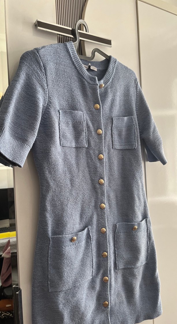 Düğmeli, kısa kollu, yuvarlak yaka, gri triko midi elbise. Dört cepli ve vücuda oturan kesimiyle rahat ve şık bir seçenek sunar.