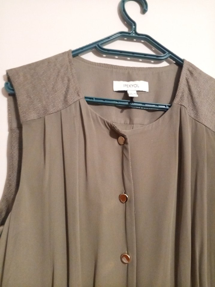 Gri renkli, düğmeli önü ve yuvarlak yakalı, sentetik kumaştan üretilmiş, bol kesim ve kolsuz hamile bluzu.