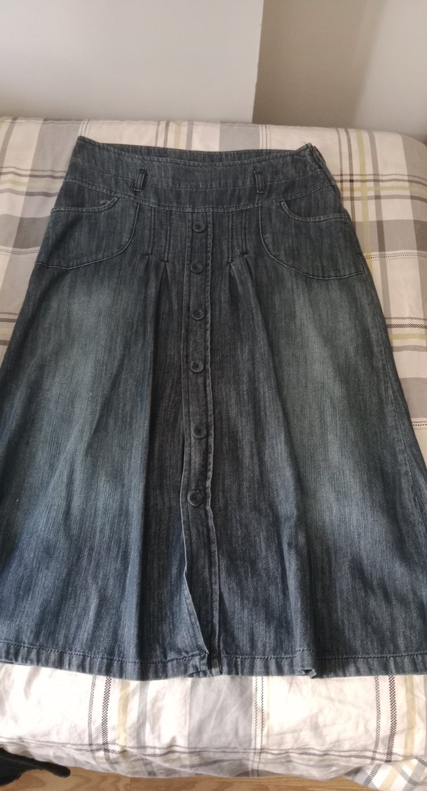 Düğmeli ön ve cepli, bol kesim gri uzun denim etek, günlük rahat kullanım için bohem tarzda.