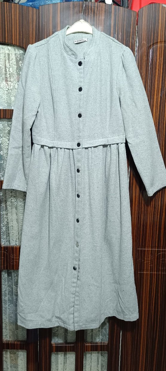 Gri renginde, düğmeli ve düşük yakali ince kaban rahat ve bol kesim kumaştan yapılmıştır.