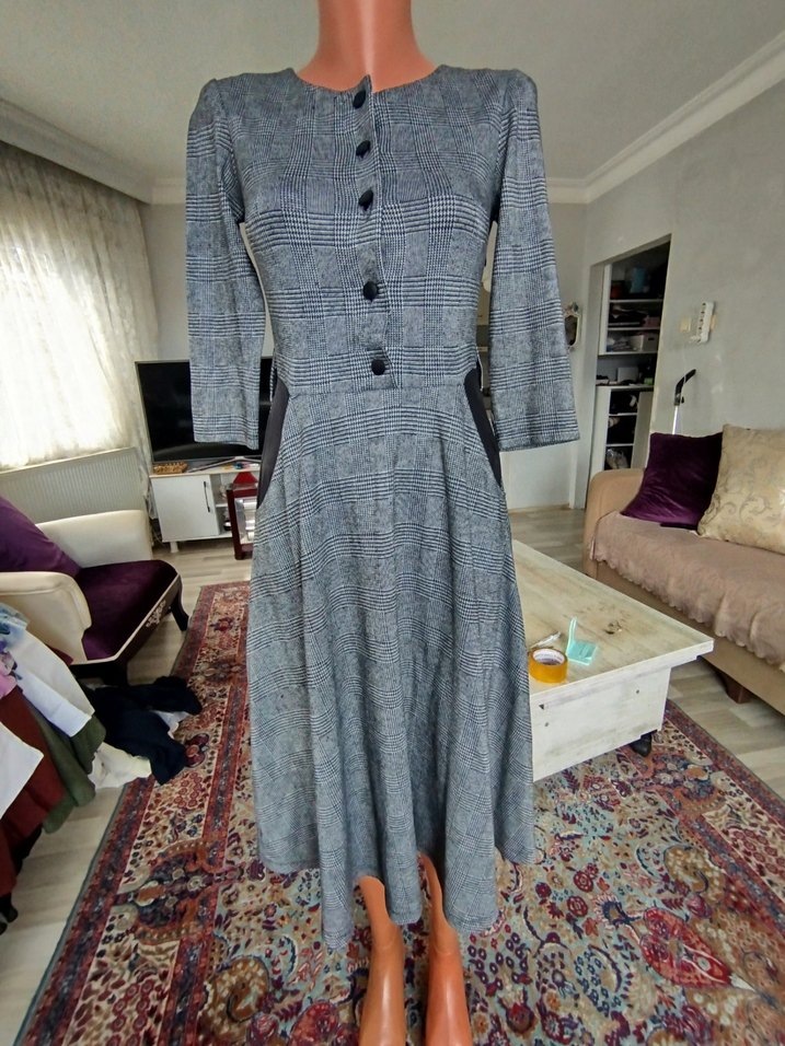 Düğmeli Gri Uzun Kadın Elbise