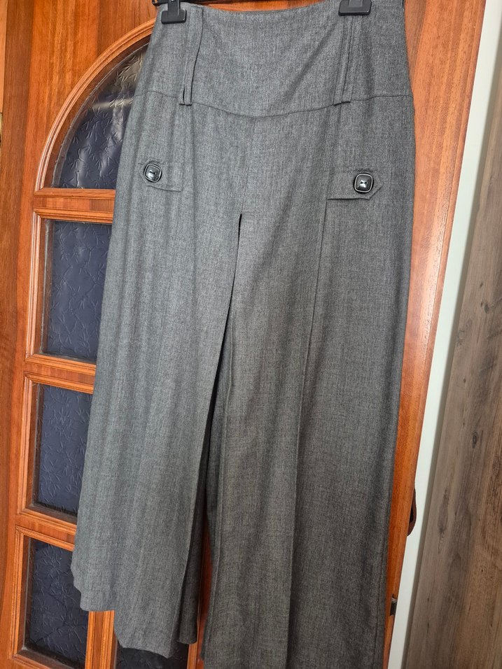 Düğmeli detaylara sahip, gri renkte, düz uzun kadın eteği. Ofis kullanımı için uygun, düz kesim ve sentetik kumaştan yapılmıştır.