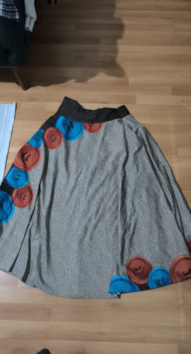 Düğmeli, renkli dairesel desenlere sahip, sentetik kumaştan gri uzun bol kesim etek. Günlük kullanıma uygundur.