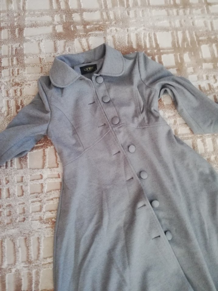 Düğmeli, gri renkte uzun kadın kaban. Yaka kısmı kesik yakalı, uzun kollu ve rahat kesimlidir. Yumuşak ve sıcak dokusuyla günlük kullanıma uygundur.