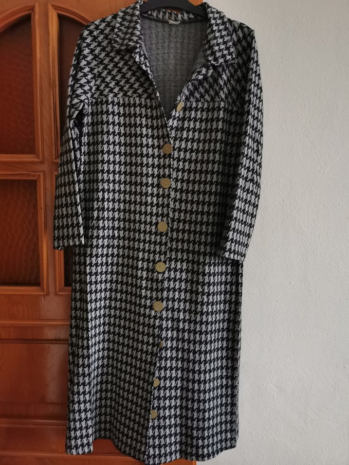 Gri renkli, düğmeli uzun kadın kaban, klasik kesim ve kareli desenle. Uzun kollu, notched yaka ve sentetik kumaştan üretilmiştir.