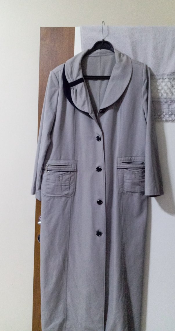 Düğmeli, uzun keten kaban, gri renkte, notched yaka ve düz tasarıma sahiptir. Uzun kollu ve cepli, günlük kullanıma uygundur.