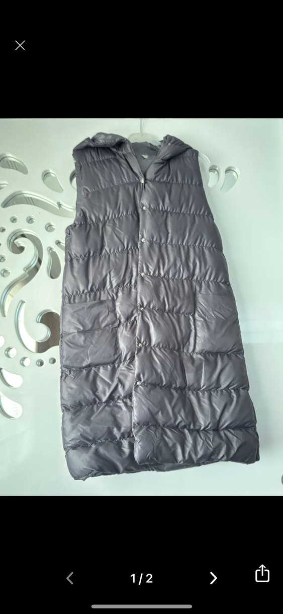 Düğmeli, uzun kesim, gri renkte, yakalı ve kolsuz kadın yeleği. Sentetik kumaştan, sokak stiline uygun, fit kesim.