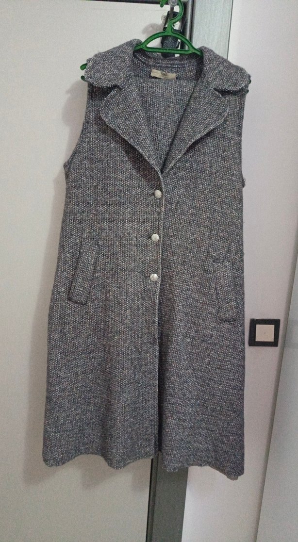 Gri yün kumaştan, düğmeli ve uzun kesim kadın süveter. Kolsuz, yakası kesik ve rahat kalıplı, günlük kullanıma uygun.ikili takım ürün benim değil nakit fiyatı